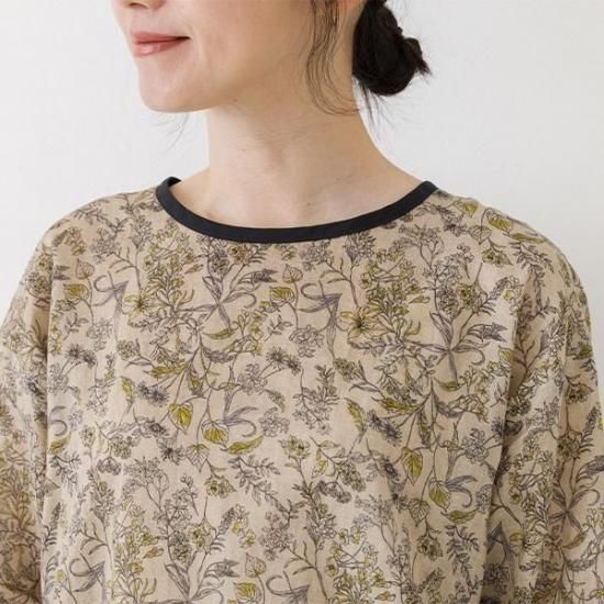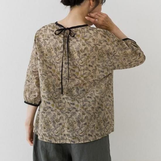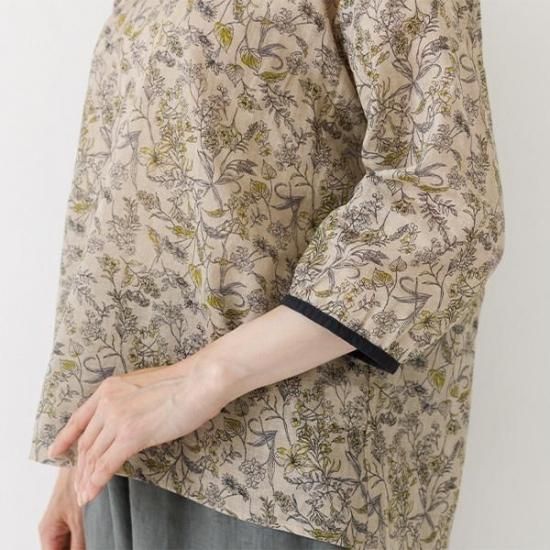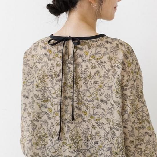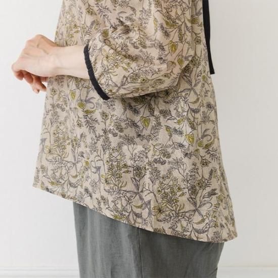・繊細なフローラルプリントと襟元の配色が、顔まわりを華やかに彩り、洗練された印象に。