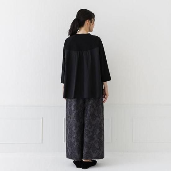 ・後身頃の異素材切り替えが、着こなしに奥行きと洗練された印象をプラスします。