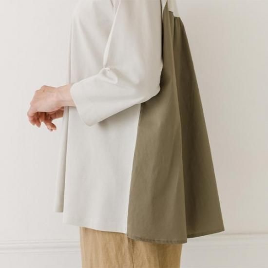 後身頃の異素材切り替えとギャザーが印象的。ドルマンスリーブのAラインシルエットで、