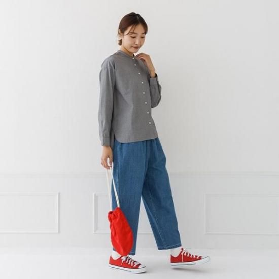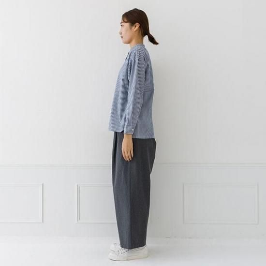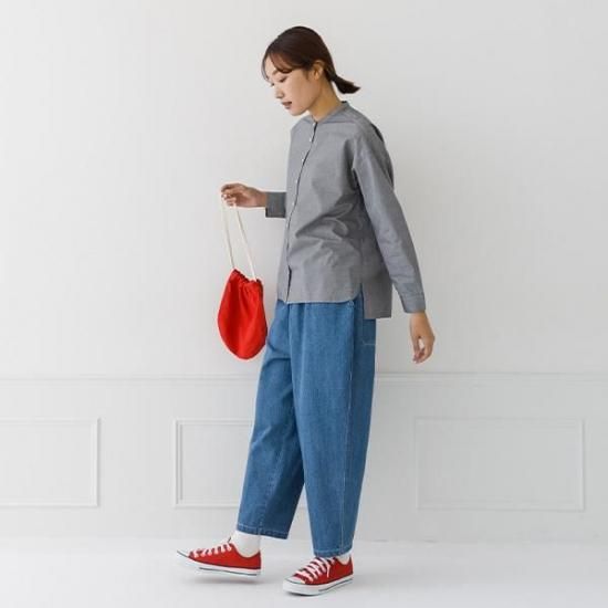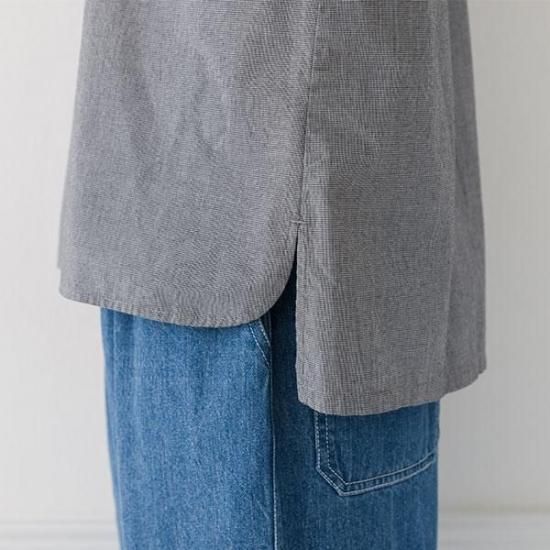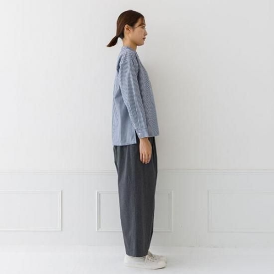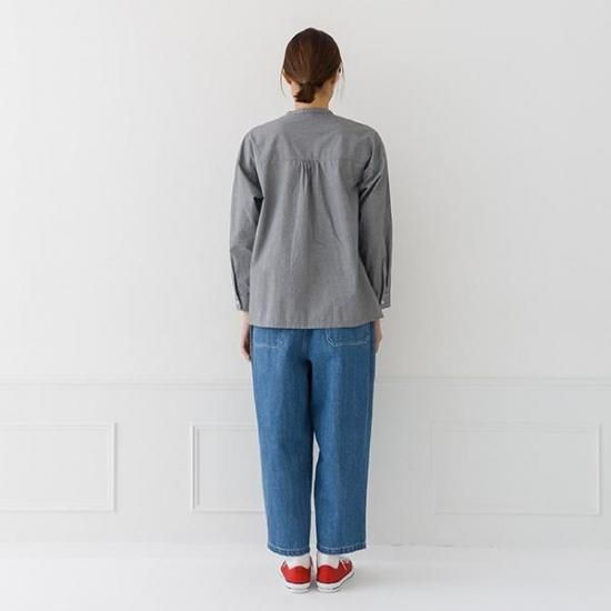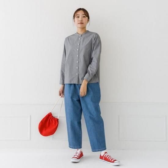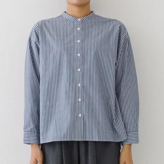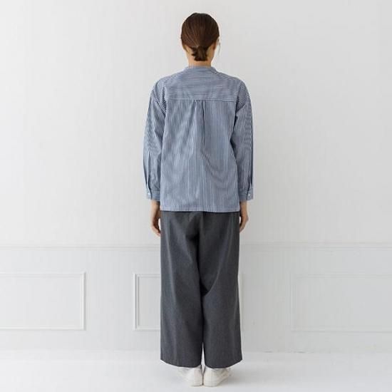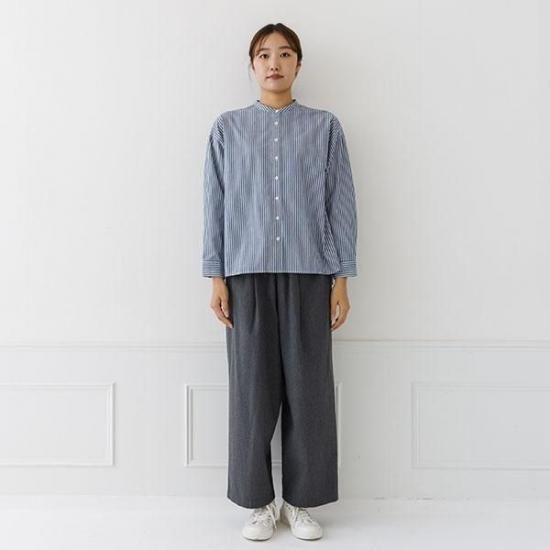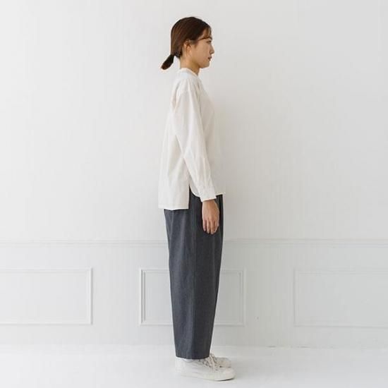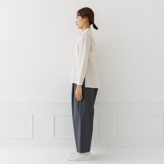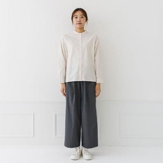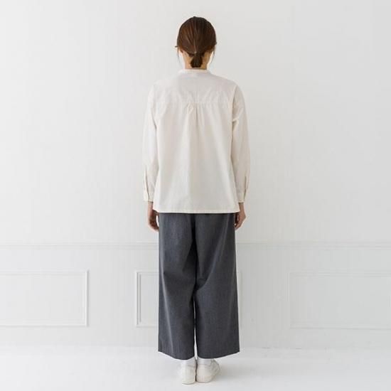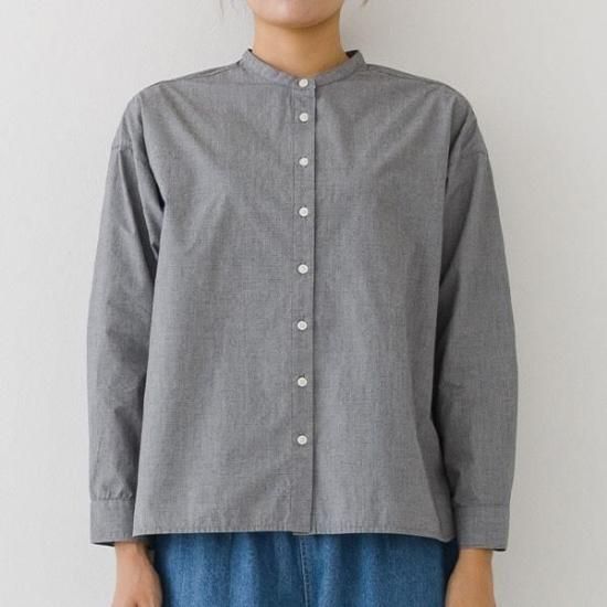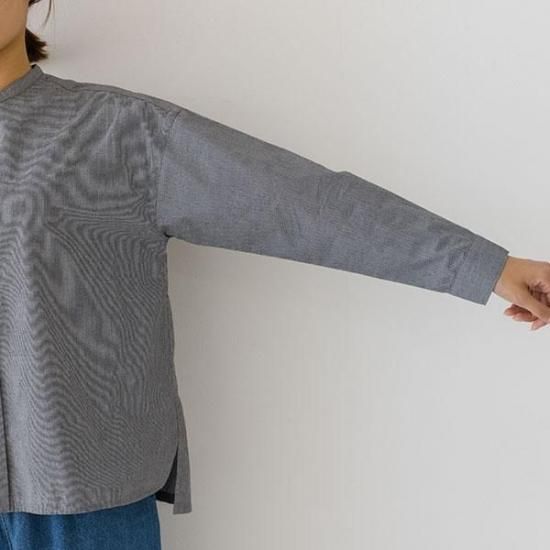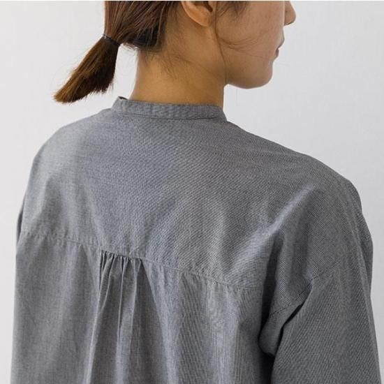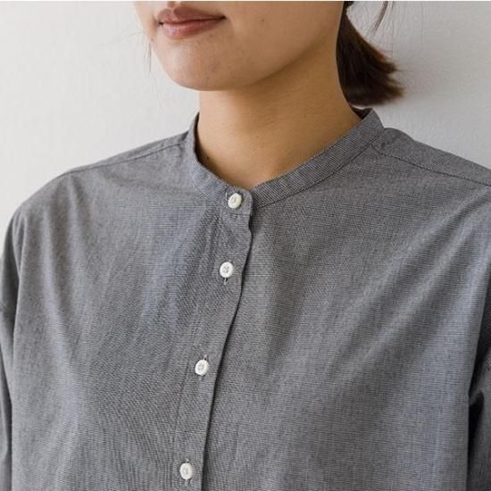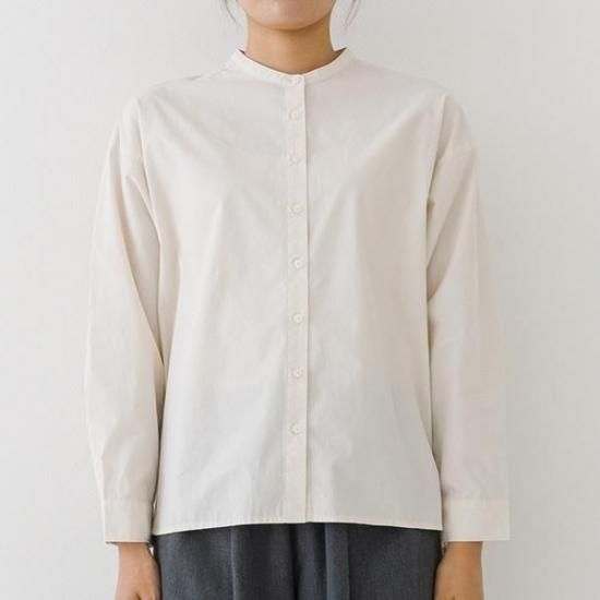首元をすっきり見せるバンドカラーと、ゆったりシルエットが洗練された印象に。