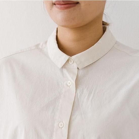 ・やわらかな印象の襟付きデザイン。ボタンの開け閉めで雰囲気を変えられます。