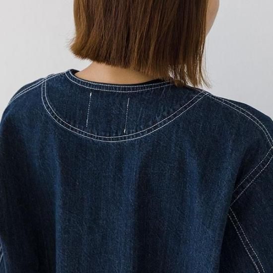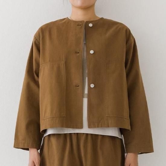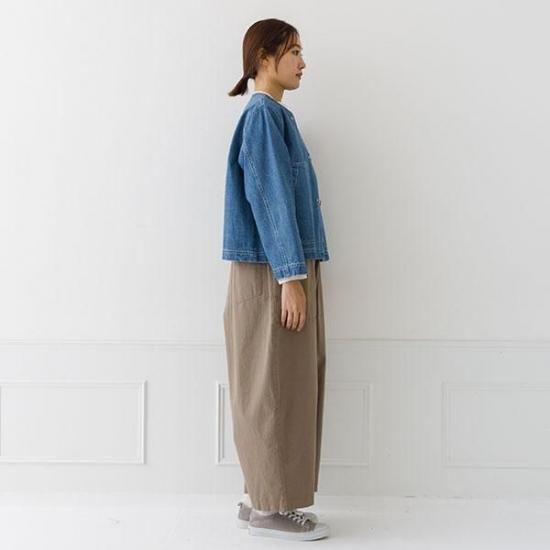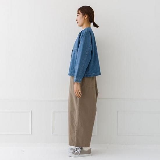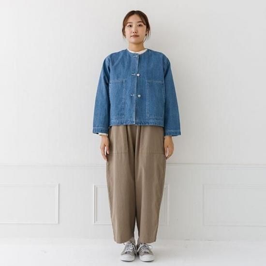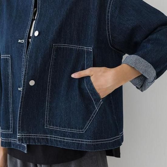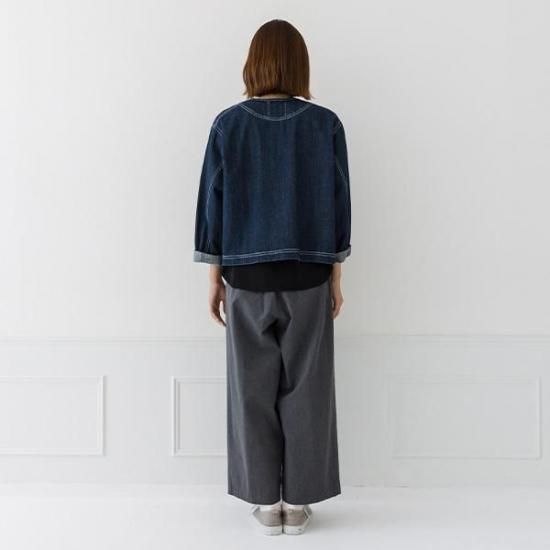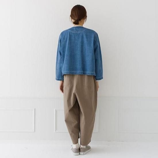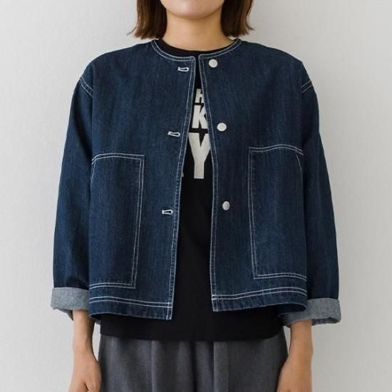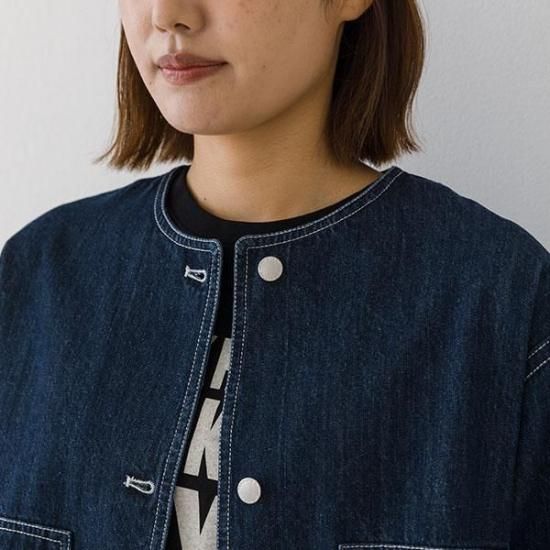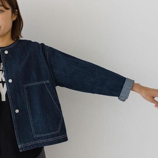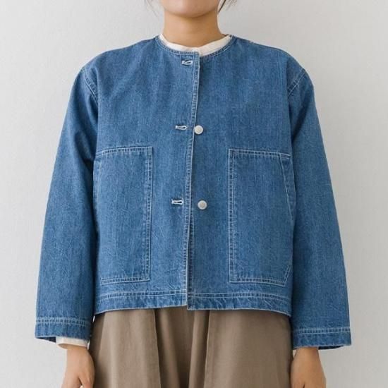軽やかな9オンスデニムのノーカラージャケット。すっきりしたネックラインと短めな着丈、