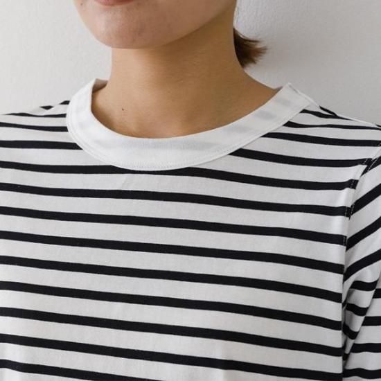 ・首元をすっきりと見せる、太めのバインダー仕様の丸首ライン。