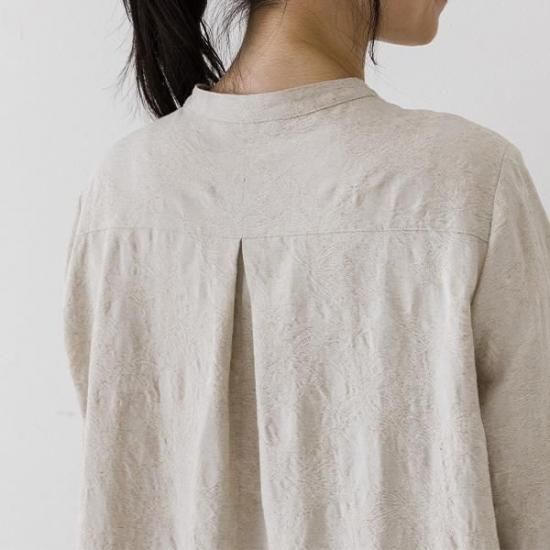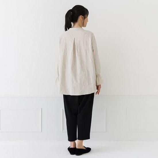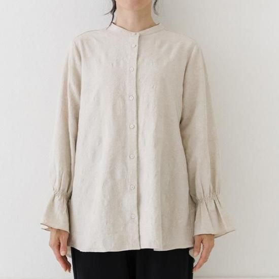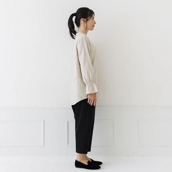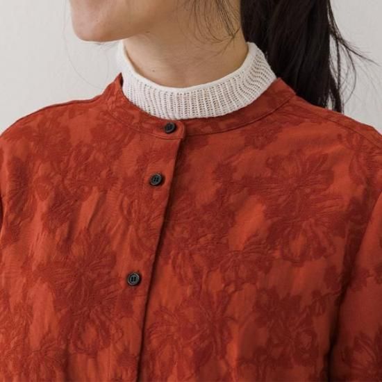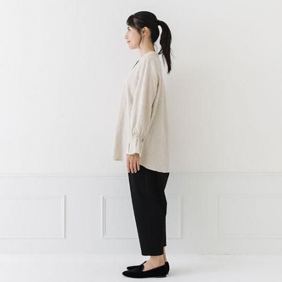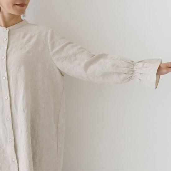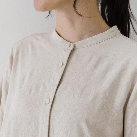 ・首元をすっきりと見せるバンドカラーが、甘すぎない洗練された雰囲気です。