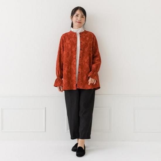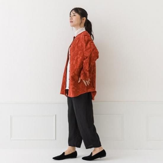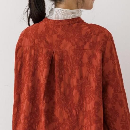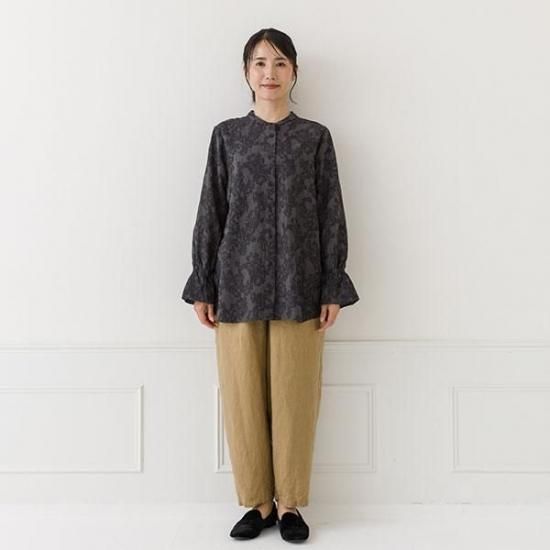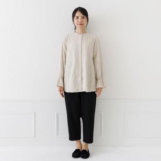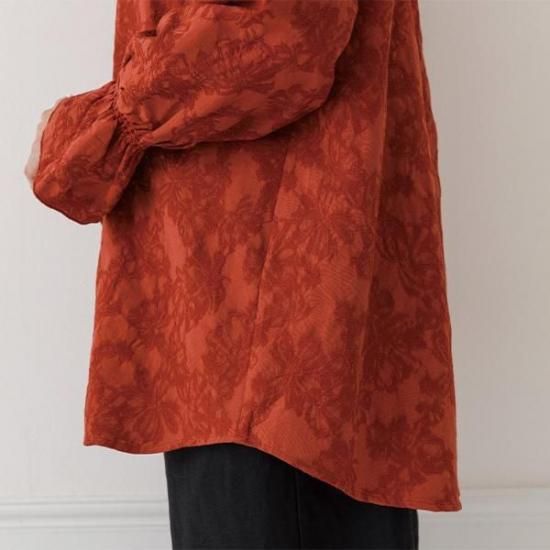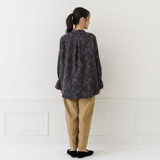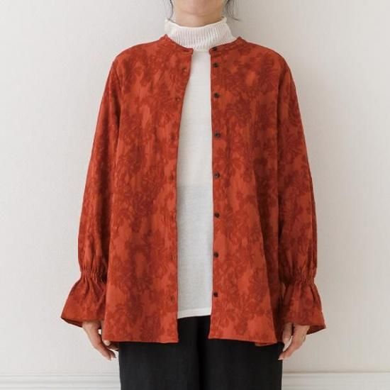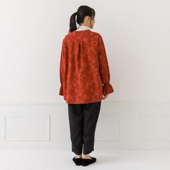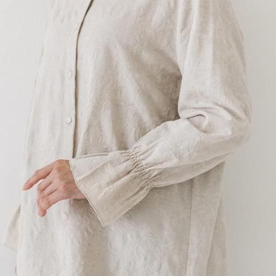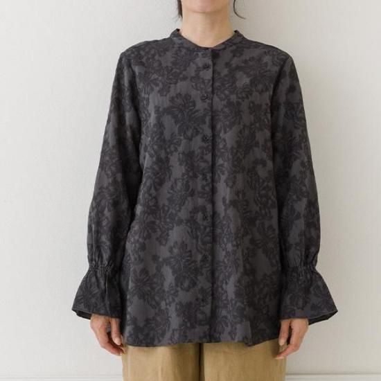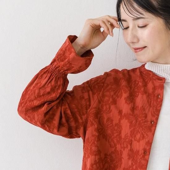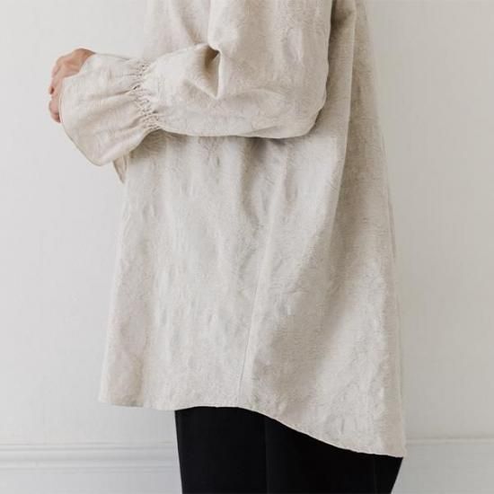 繊細な花柄ジャガードと袖口のフリルがポイントのロングブラウス。