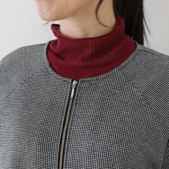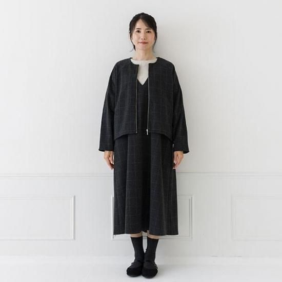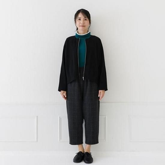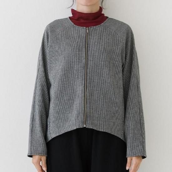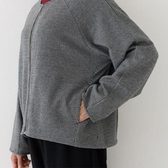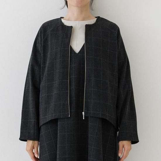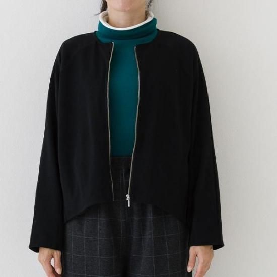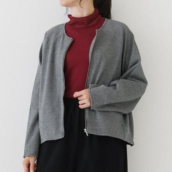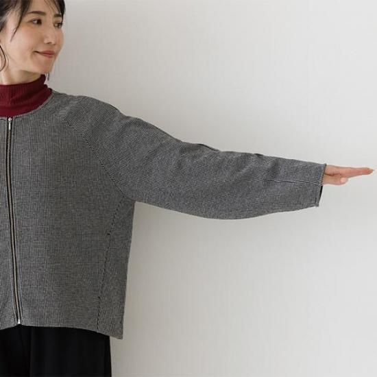 ・顔周りをすっきりと見せるノーカラーと、着脱しやすいファスナーが特徴です。