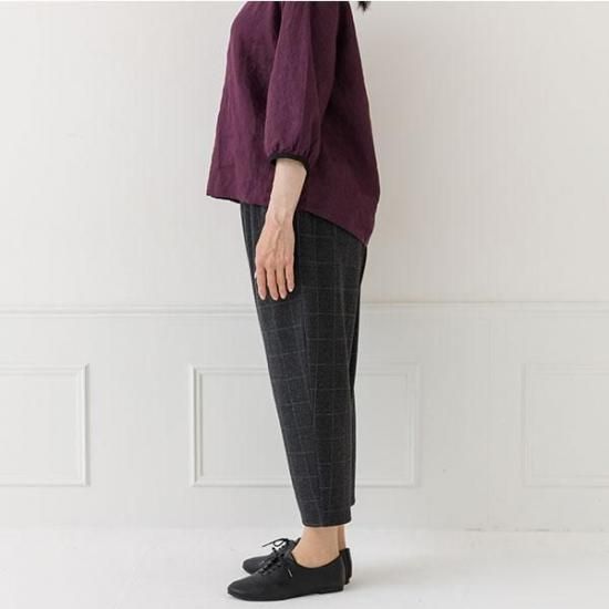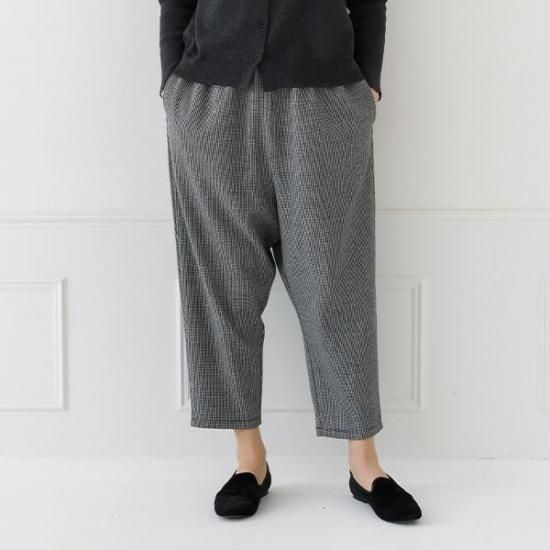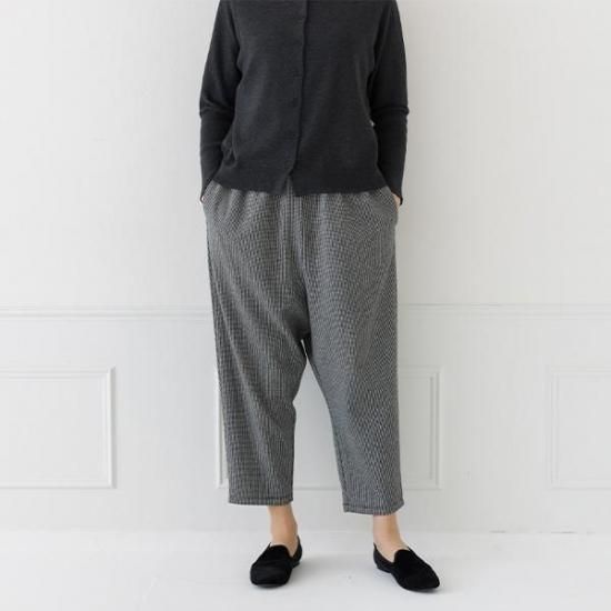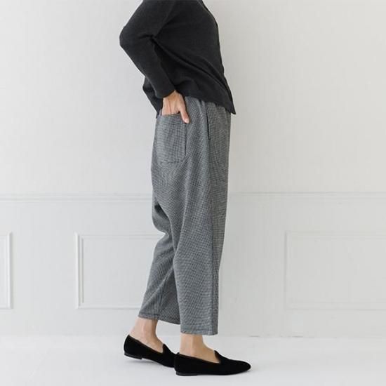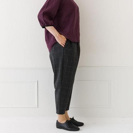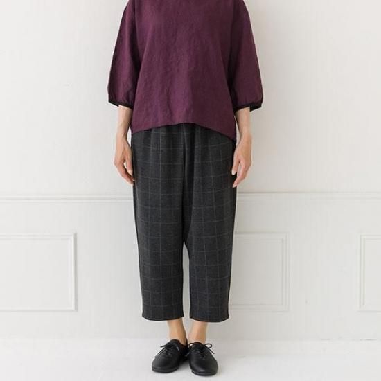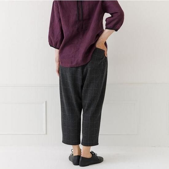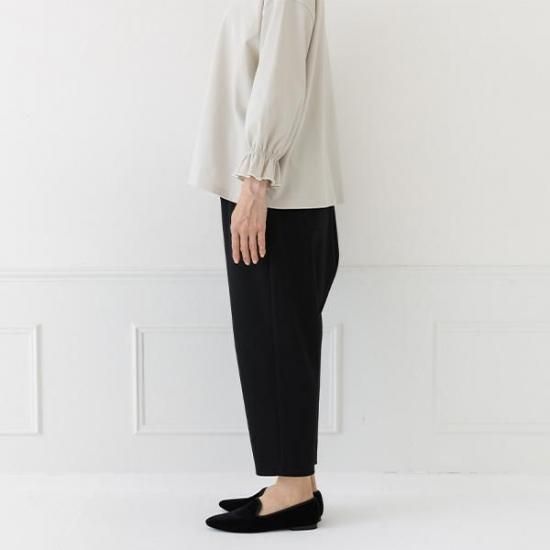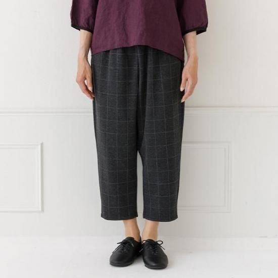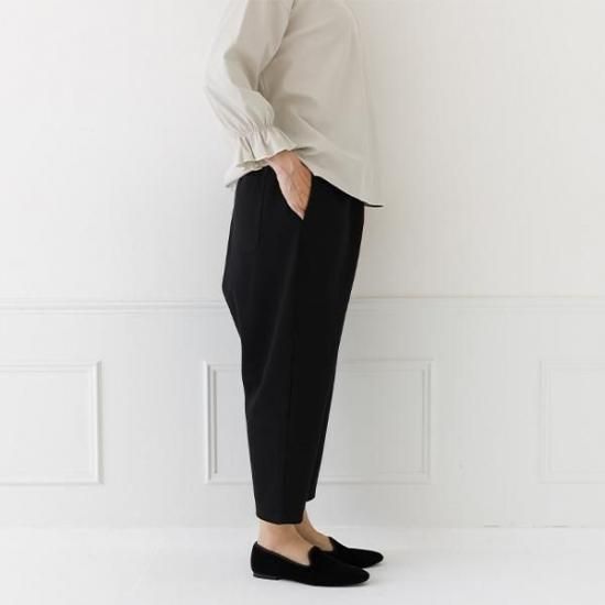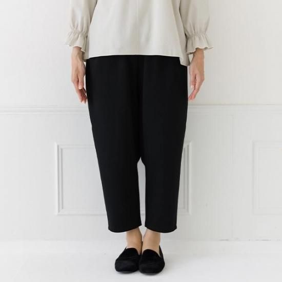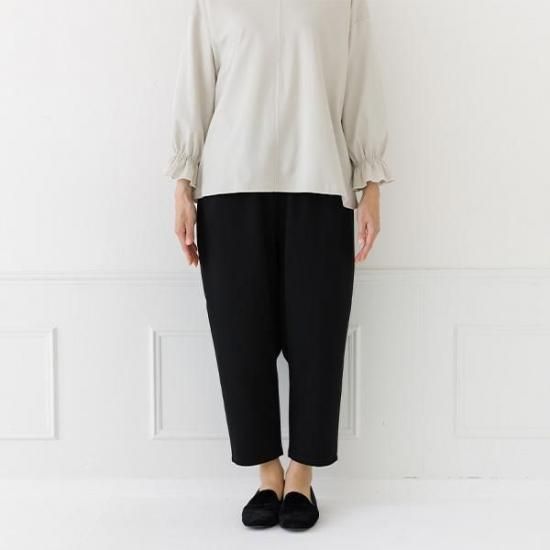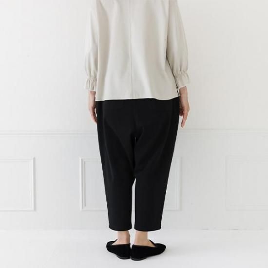 コクーンシルエットが体型をカバーしつつすっきり見せるパンツ。