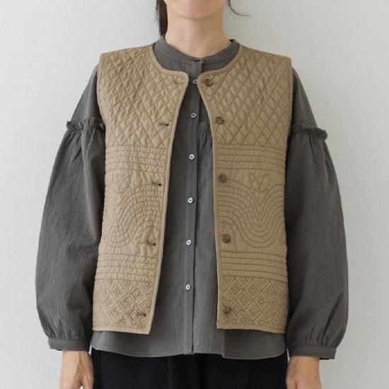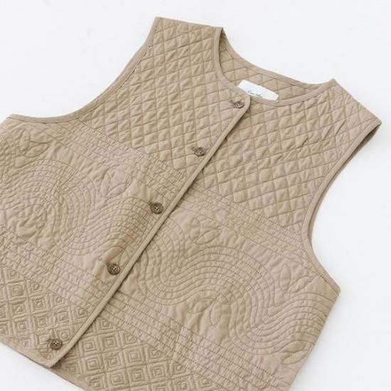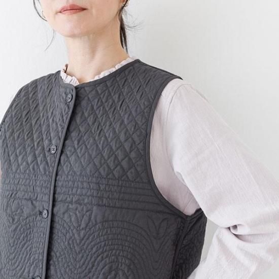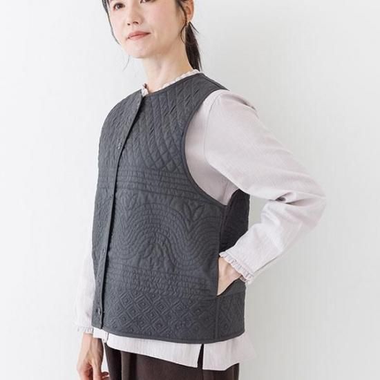 ノーカラーの短丈デザインに、曲線と幾何学模様を組み合わせた凝ったキルティング柄が特徴。