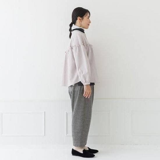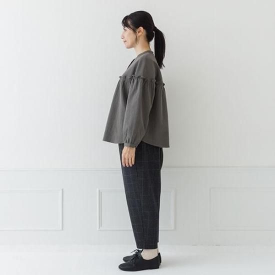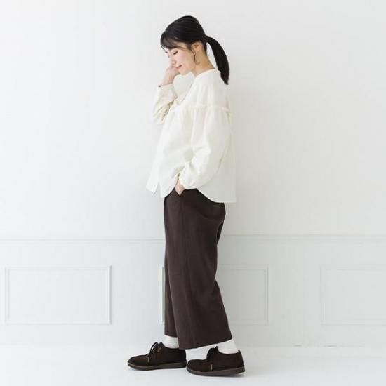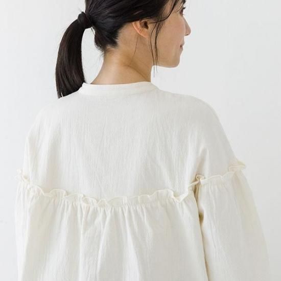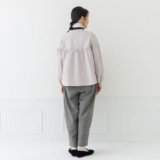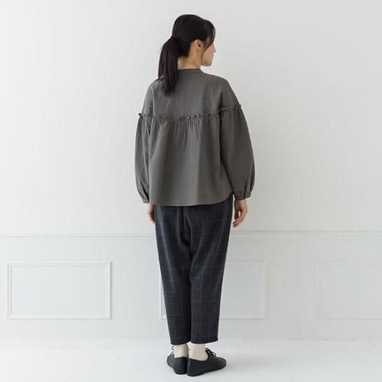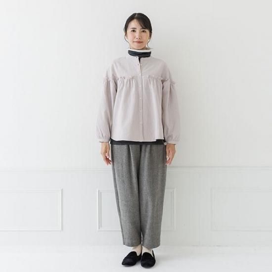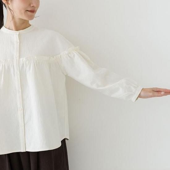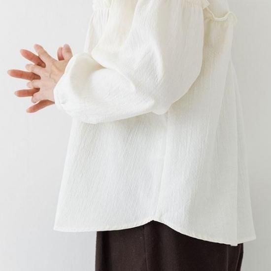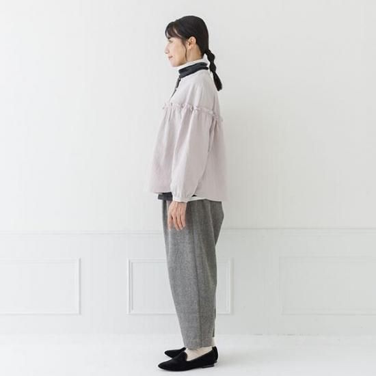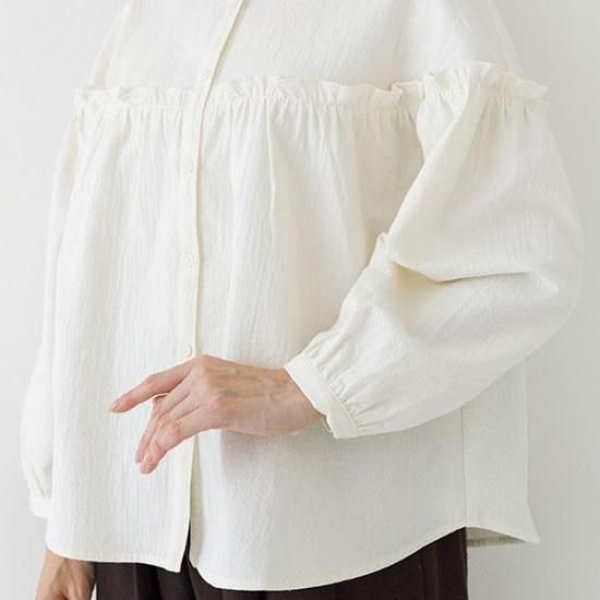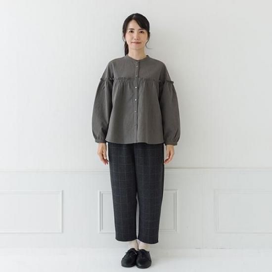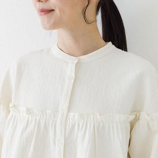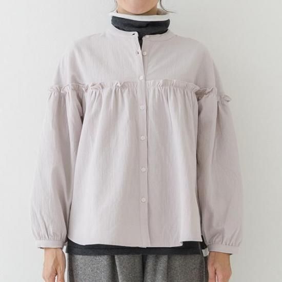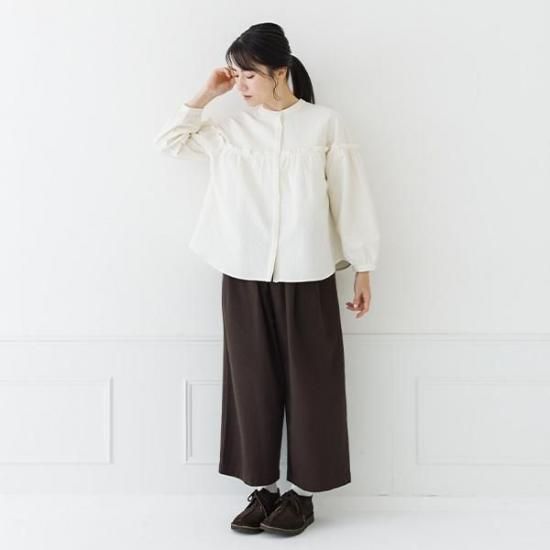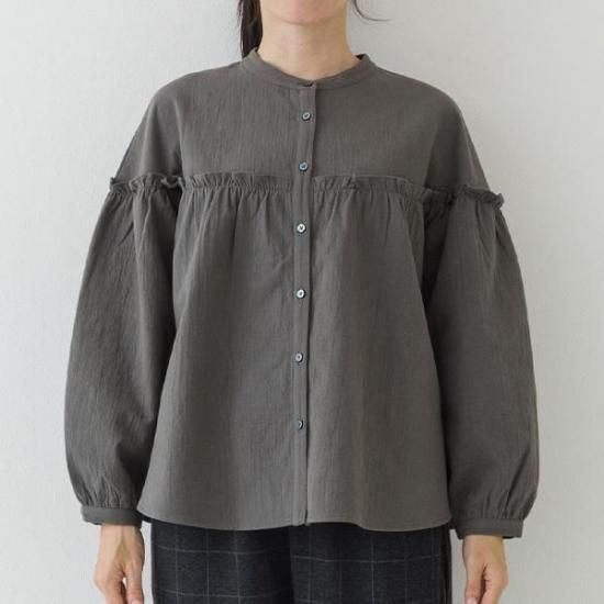 バンドカラーで上品に、ボリューム袖とギャザーでフェミニンに仕上げたブラウス。