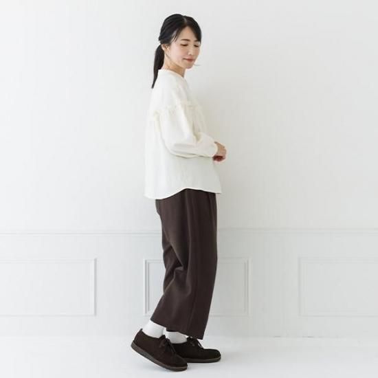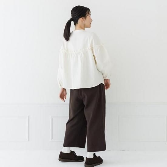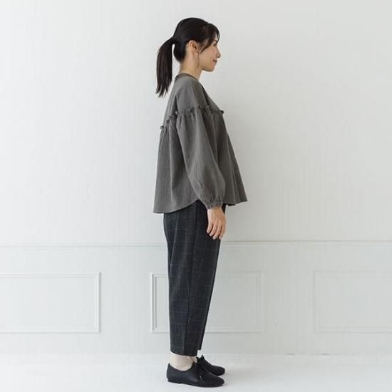 ・細身のパンツと合わせて、ブラウスのボリュームを引き立てるメリハリコーデに。