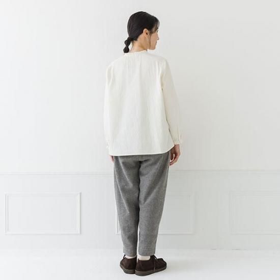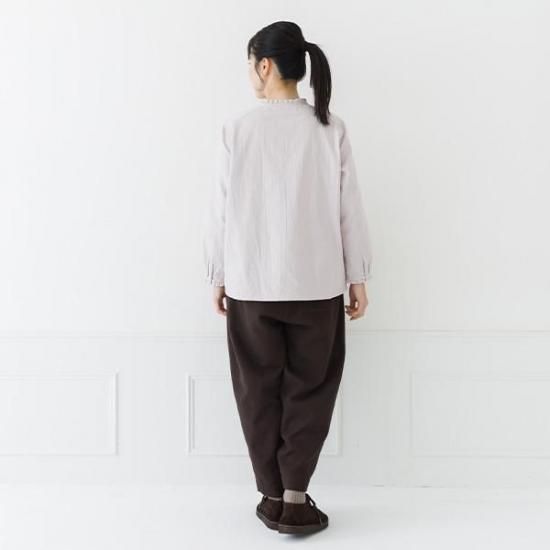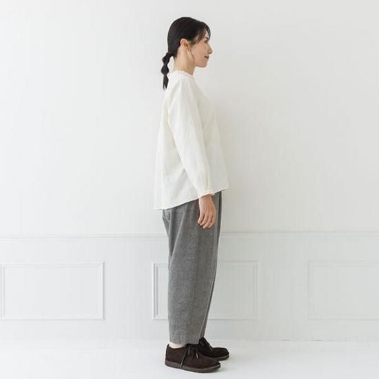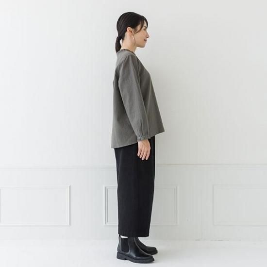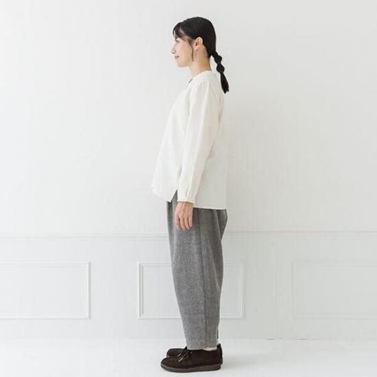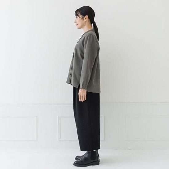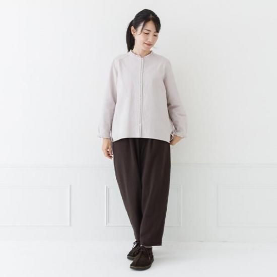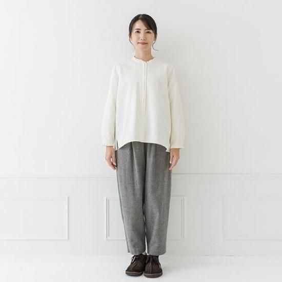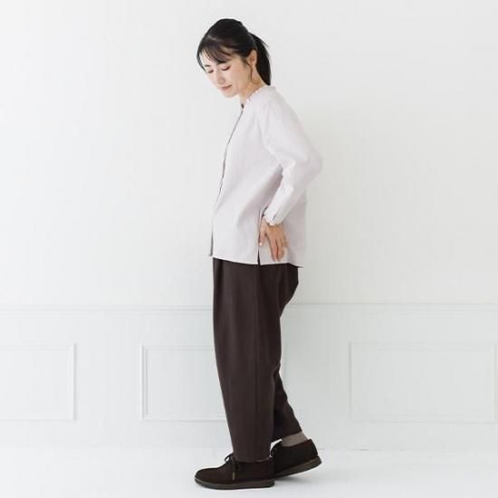 バンドカラーとセットインスリーブですっきりと見え、厚手の生地で優しく暖かな着心地です。
