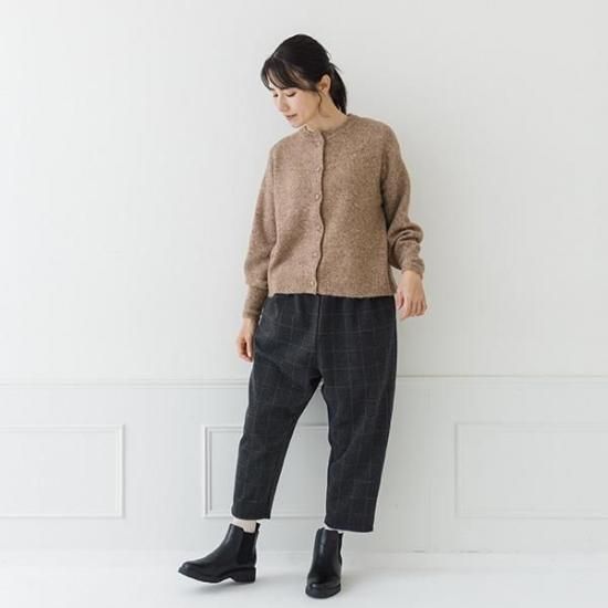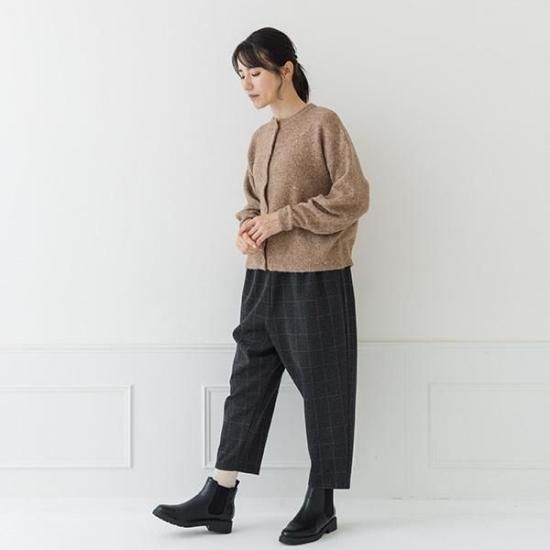 くるみボタンとふっくらパフスリーブがクラシックな印象。キャメル混素材の暖かさと