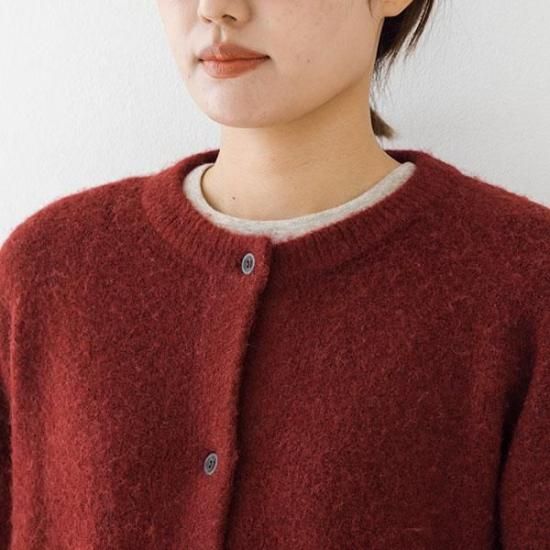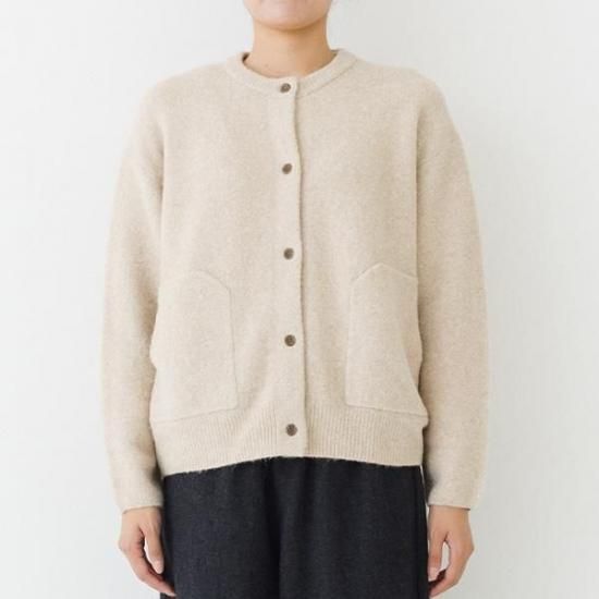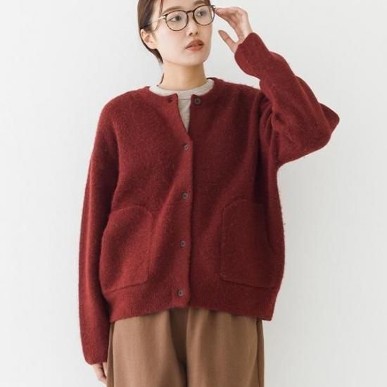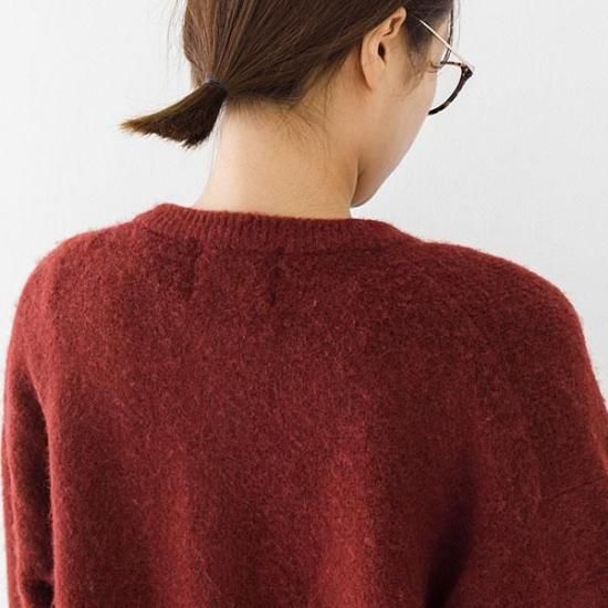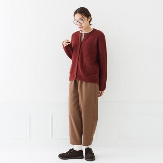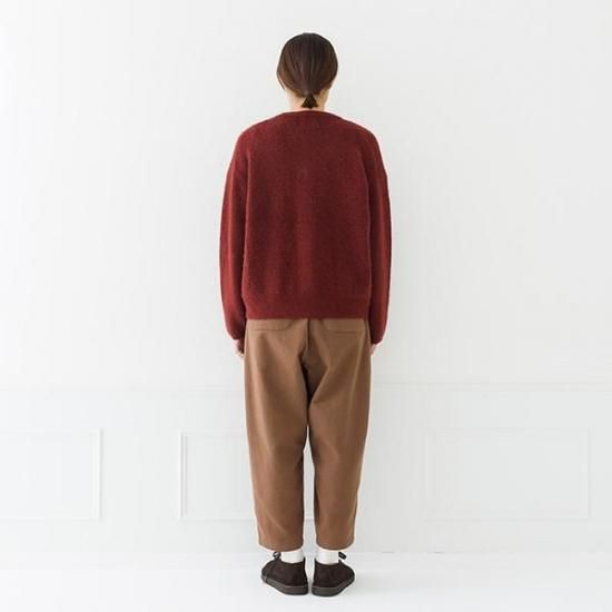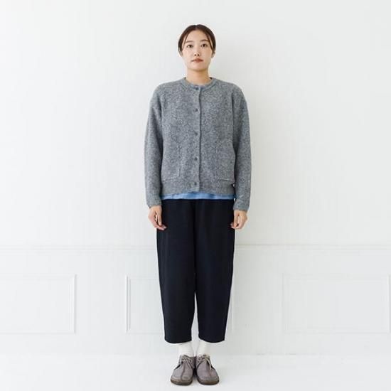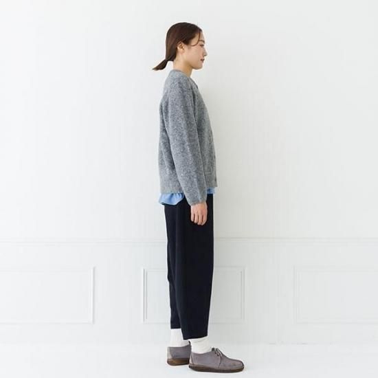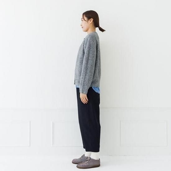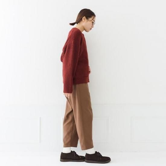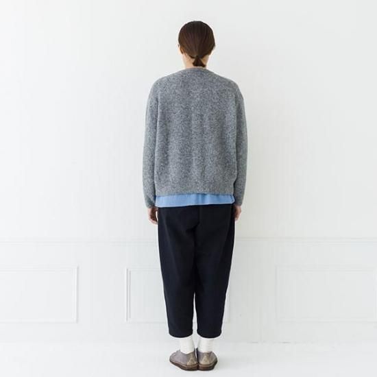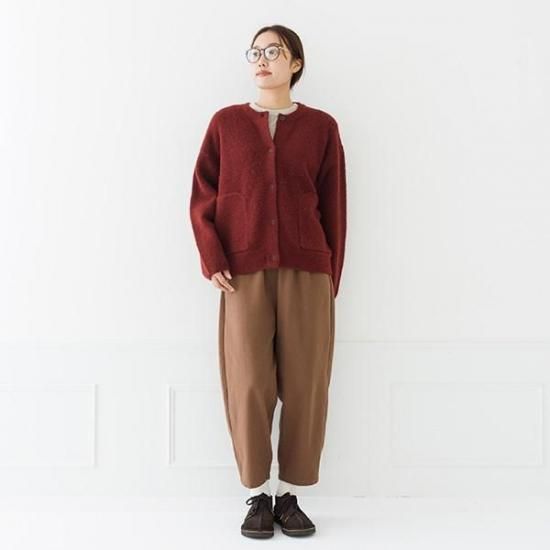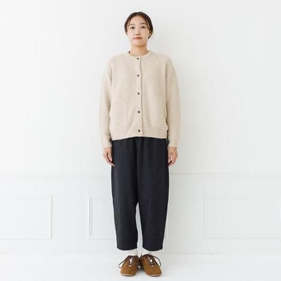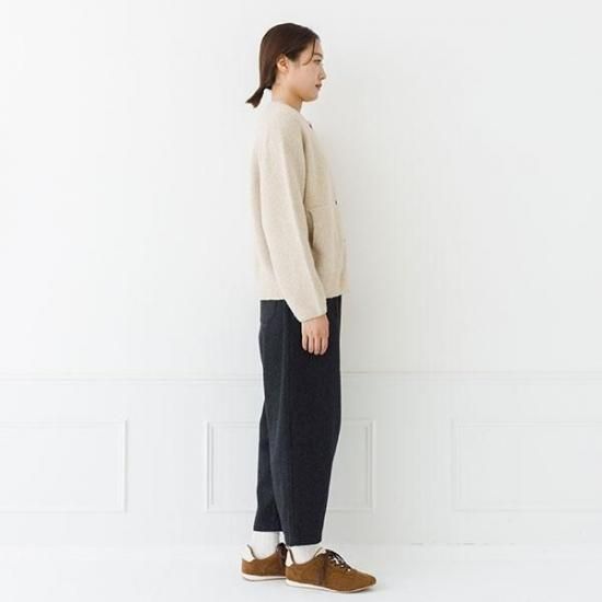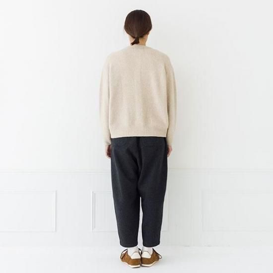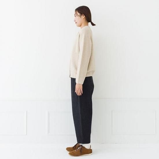 ・ボタンを全て留めて、プルオーバーニットのように着れば、ワイドパンツと好相性です。