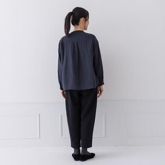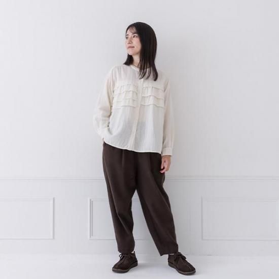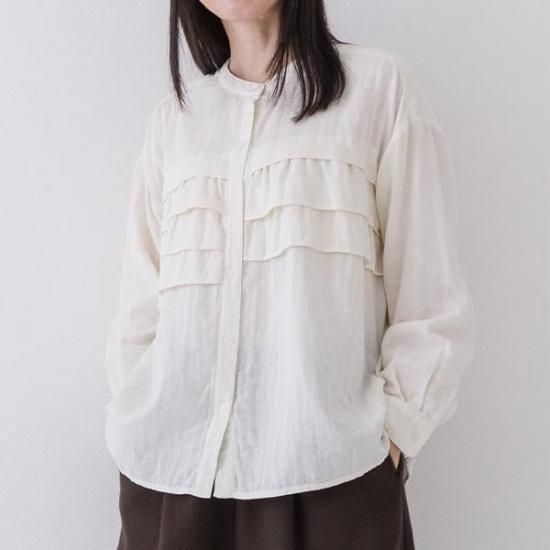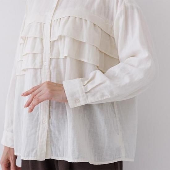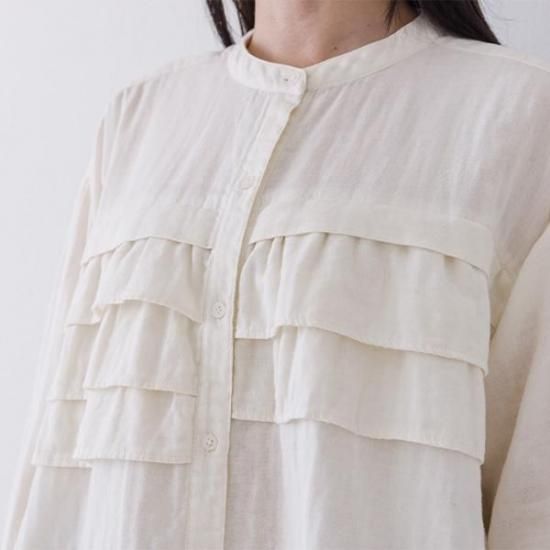 バンドカラーとWガーゼ素材で甘さを抑えた、大人のためのフロントアシメフリルブラウス。