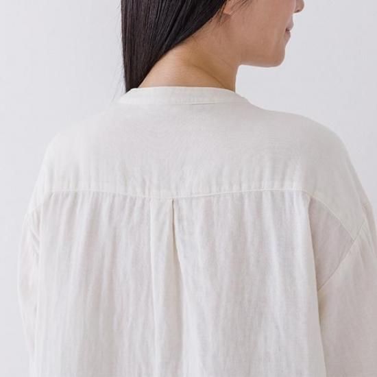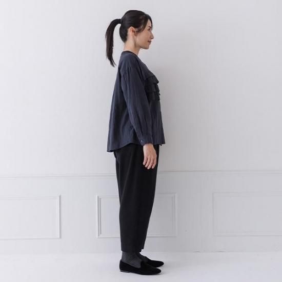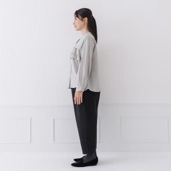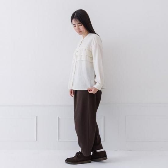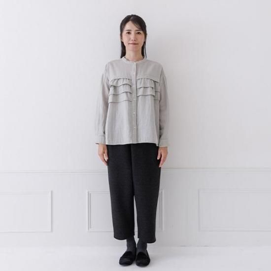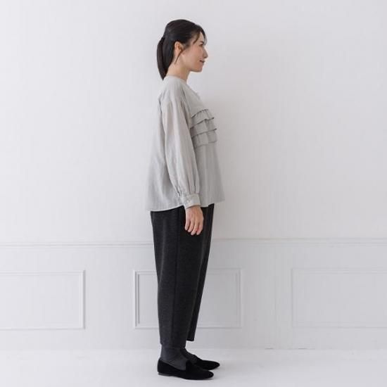 ・首元はすっきりとしたバンドカラーで、フリルの甘さを引き締める洗練された印象です。