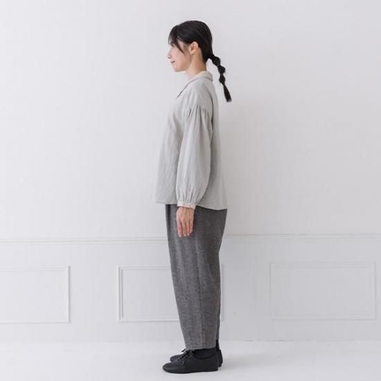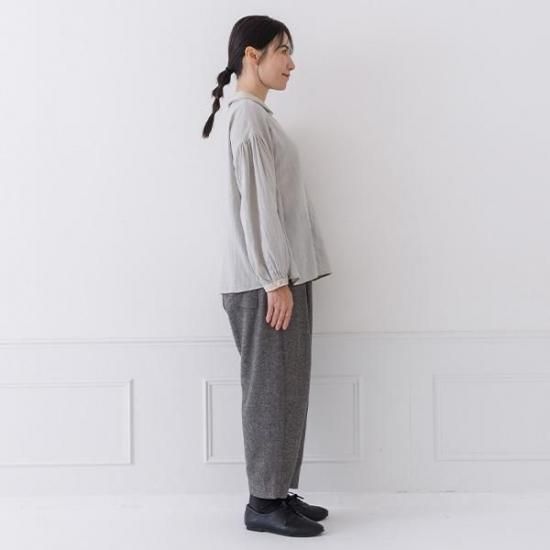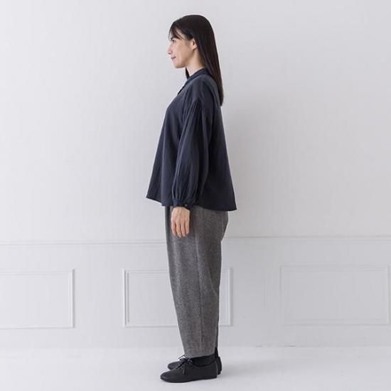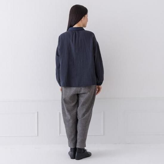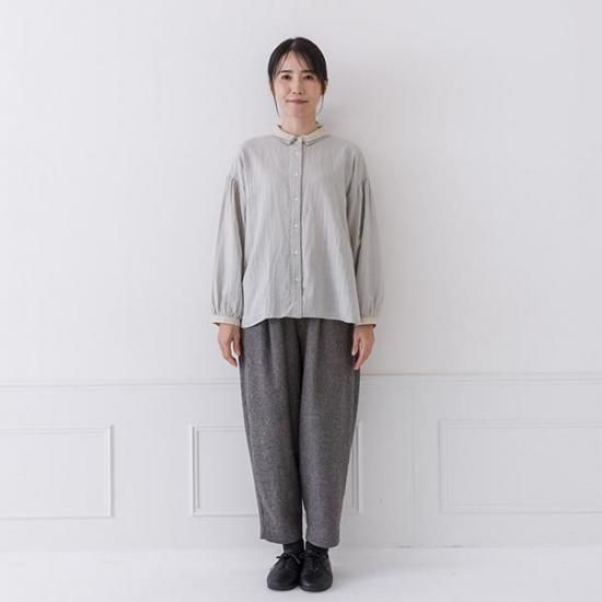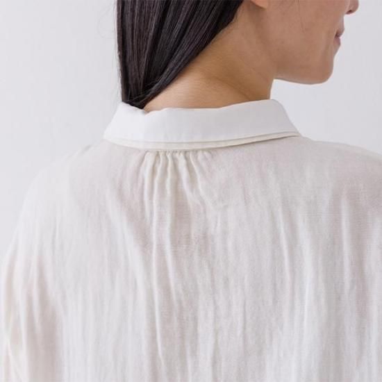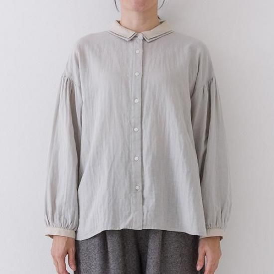 Wガーゼ素材で優しい肌触りのブラウス。異素材の2枚襟とボリューム袖が、