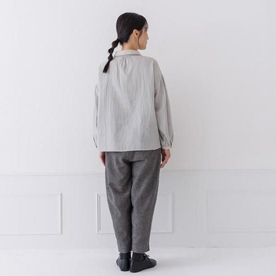 ・首元のヨーク下に細かなギャザーを施し、後ろ姿の自然なドレープとふんわり感を強調します。