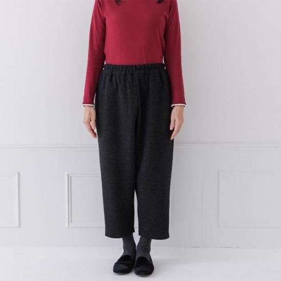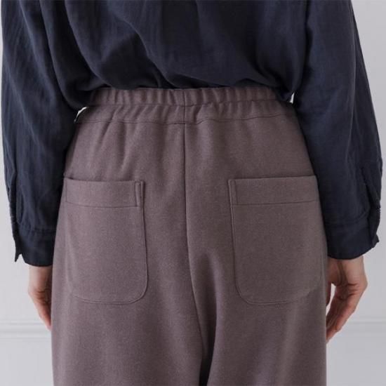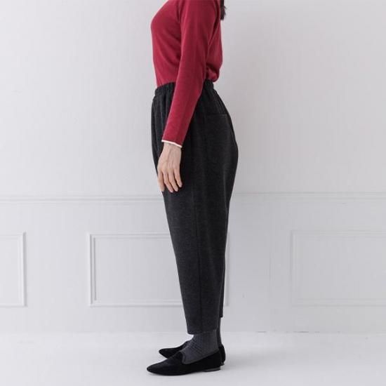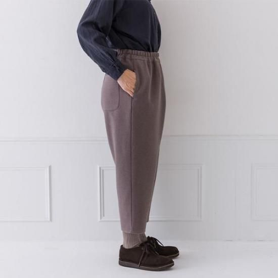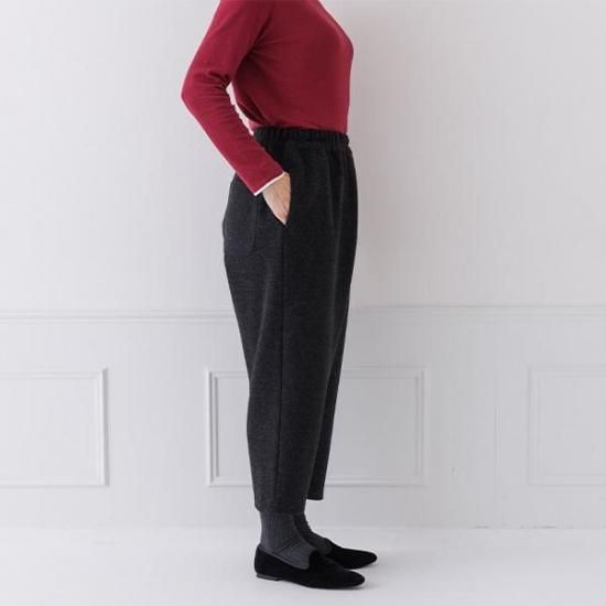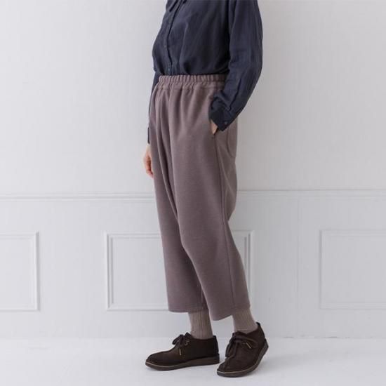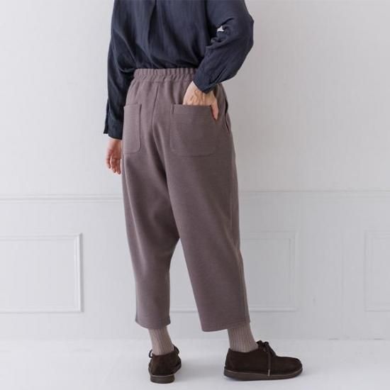 縮ポンチ素材で軽く暖かいパンツ。ウエスト総ゴムで楽な穿き心地ながら、