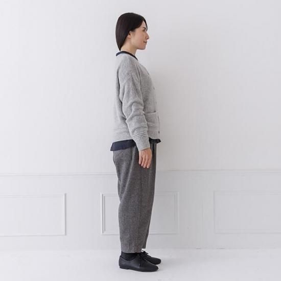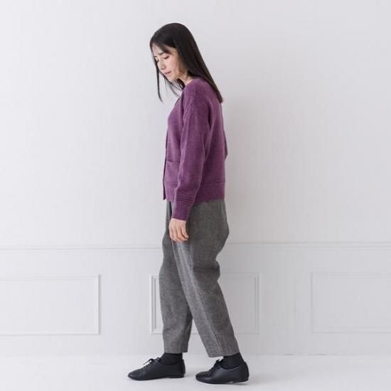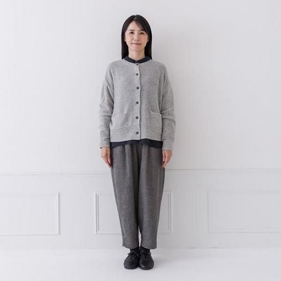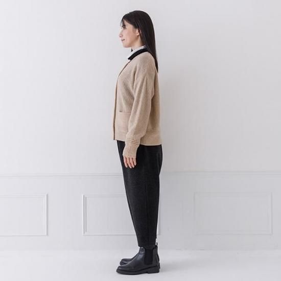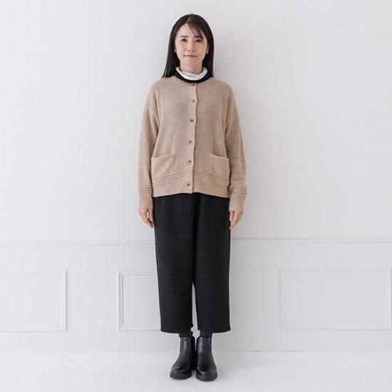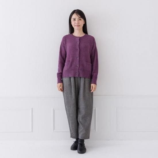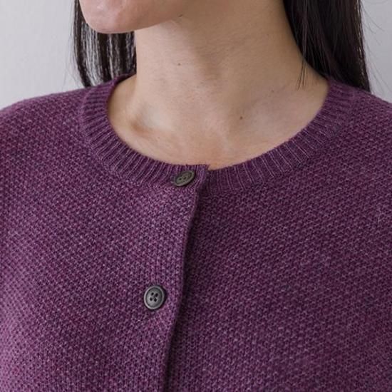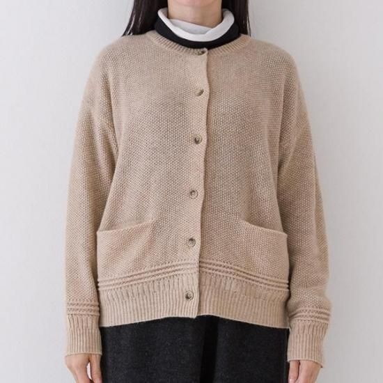 ラムウール混の暖かなカーディガン。鹿の子編みの豊かな表情とクルーネックで上品さを