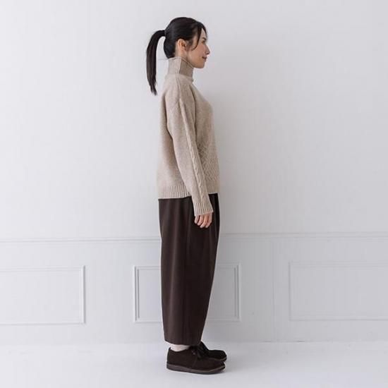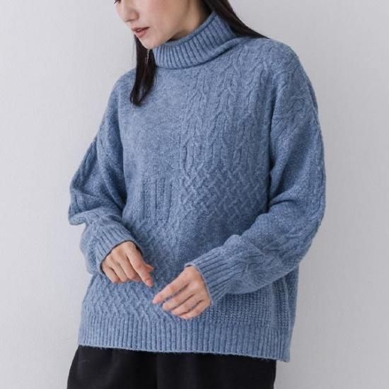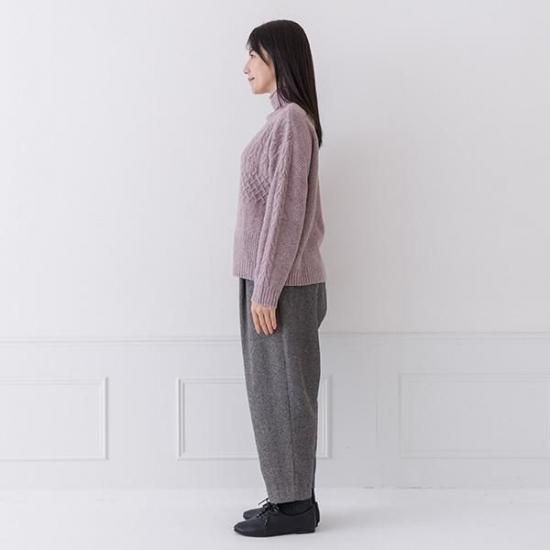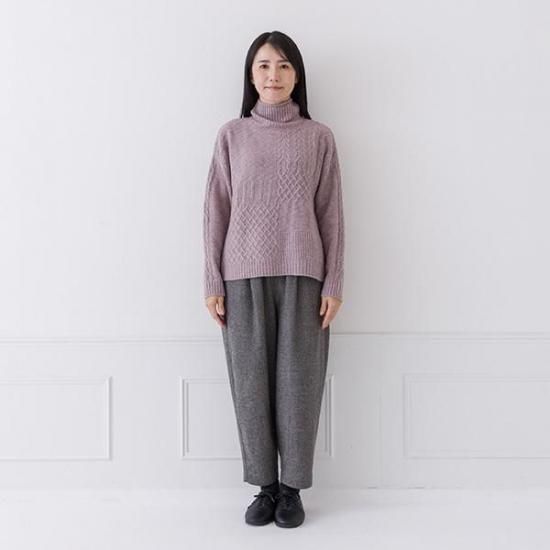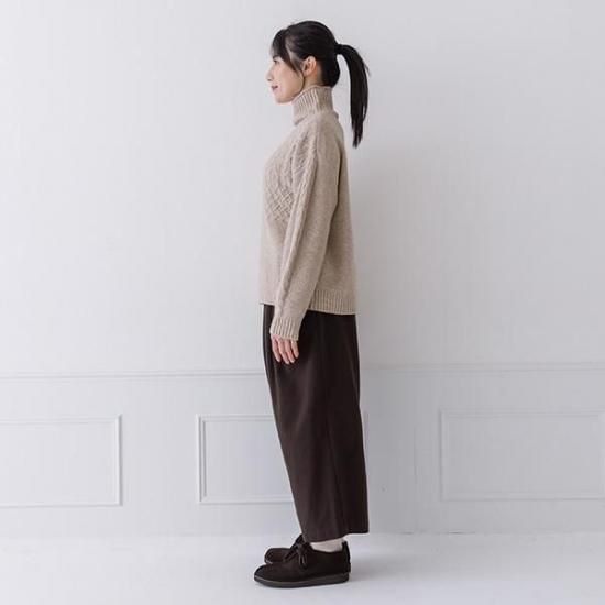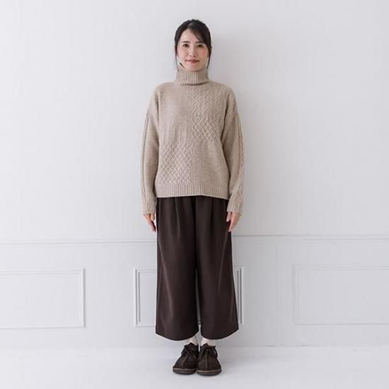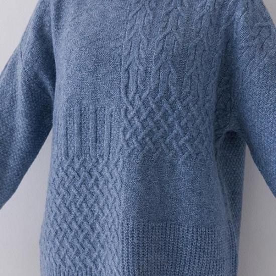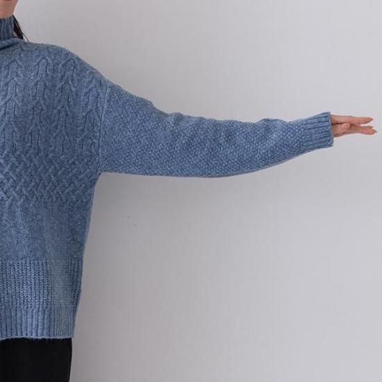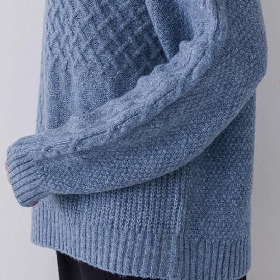 ・縄編みやダイヤ柄など、複数の編み柄を組み合わせたディテールがデザインのアクセントです。