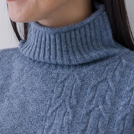 ・太めのリブ編みネックが首元をしっかり覆い、暖かさと小顔効果を両立します。