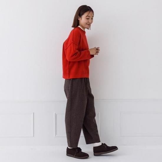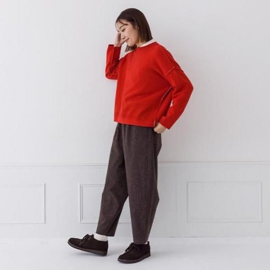・ダークトーンのボトムスと合わせると、セーターの鮮やかさが引き立ちます。