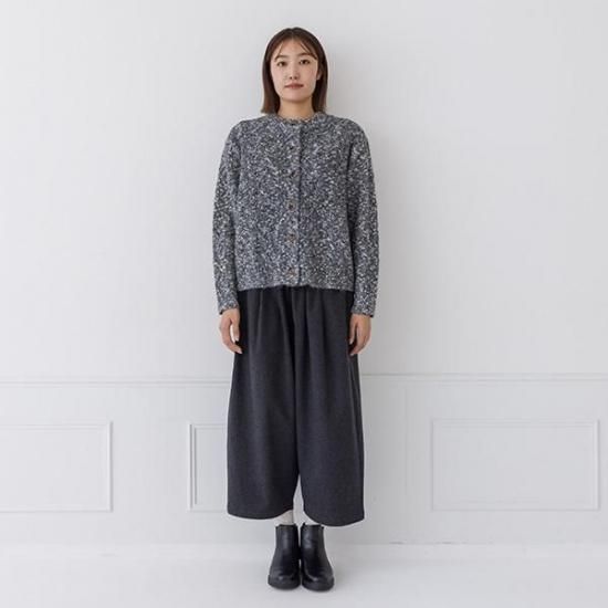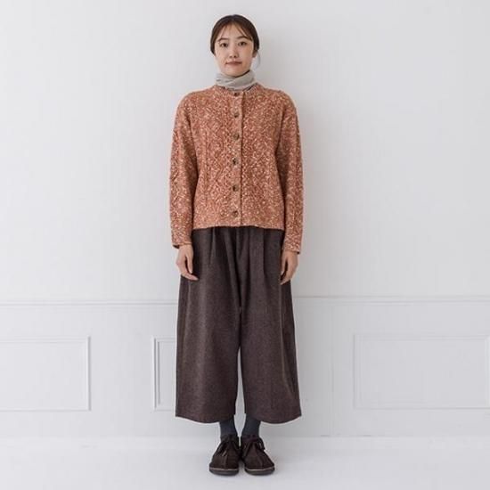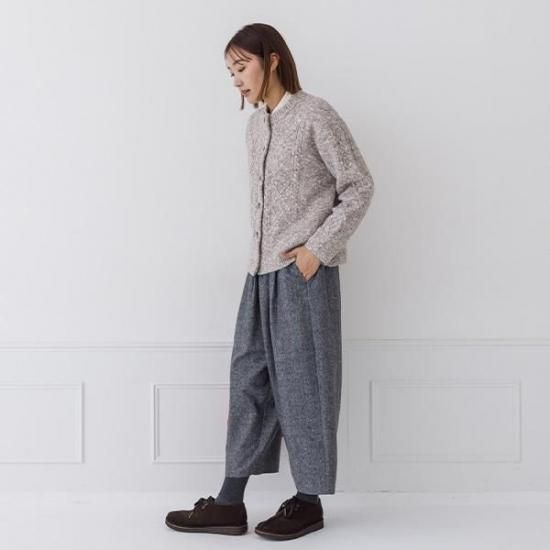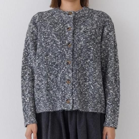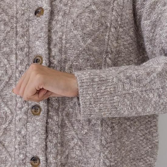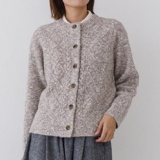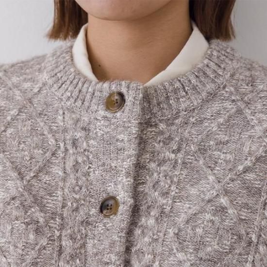メランジニットにケーブル編みを施したクラシカルなカーディガン。